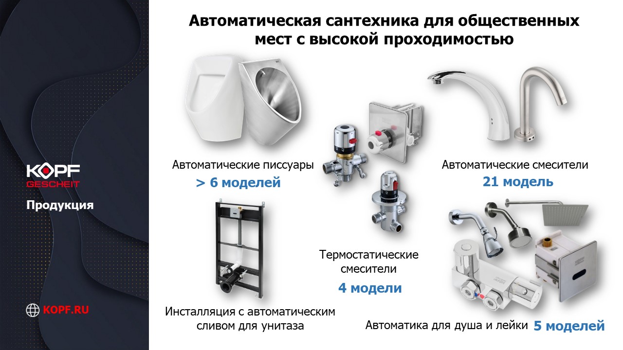 1) Экономия воды – снижение потребления на 50 – 70%. 2) 6 вариантов подключения электропитания, из них 3 варианта – батарейки АА, аккумуляторная батарея типа PowerBank и «Генератор» Kopfgescheit – делают энергоснабжение сантехники полностью автономным, не зависящим от сети 220 В. 3) Повышается бесперебойность работы сантехники, потенциально это позволит снизить время обслуживания. 4) Повышенная вандалозащищенность. 5) Полная замена импортных оборудования и комплектующих